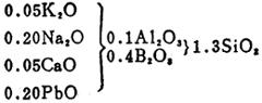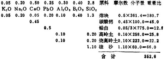 然后再计算熔块釉按重量的配方。 熔块釉中所需的熔块量,可用“釉式”与“熔块式”之间的简单比例关系进行计算。例如,在此情况下,以含0.8B2O3的熔块与含0.4B2O3的釉比,即0.4÷0.8=0.5,即是熔块的当量数。该值的重量为361.4×0.5=180.7,加入0.5当量的熔块引入0.4B2O3,同时含有其它成分为0.05K2O、0.2Na2O、0.05CaO、0.2PbO、0.1Al2O3及1.3SiO2,从原来釉式中减去上述这些量,再加入生原料来满足其余的成分要求。 熔块釉的配方计算如下: