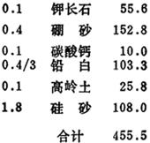 (7)因氧化铅及其它铅化合物有毒,应尽可能引入熔块. 按照这些规则处理上述给定的釉式时,大致符合要求的熔块釉式如下: