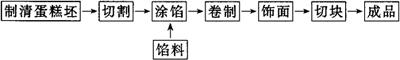 3.制作方法 (1)制清蛋糕坯 方法同清蛋糕制作,但糕糊是舀在擦过底油的烤盘里进行烘烤的,糕坯不能烤得太老,出炉温度以不超过200℃为宜。糕坯厚度视制作卷筒蛋糕的不同也可有一些差异。 (2)切割 在洁净平台上垫干净白布或无菌白纸,糕坯出模于上,修割成较规则的长方形,趁热用刀剖为两片,每一片厚度均匀,剖面要平整。 (3)涂馅 糕坯剖面朝下,取与糕坯体积相仿的奶油膏(或蛋白膏、或果酱)涂刮于剖面上,并刮匀,刮平整。 (4)卷制和饰面 将刮好的糕坯卷成长圆筒形,固定之后,在圆筒上拉两道奶油花纹,撒些胡桃碎片,固定宜趁热进行。 (5)切块 卷筒和饰面完工之后,按要求的重量切成长度一致的小段块,此即为卷筒蛋糕。 4.质量要求 规格形状:圆柱形,断面似马蹄形。 色泽:糕坯蛋黄色,糕坯与夹馅色条鲜明。 组织状态:松软,切口平整,夹馅与糕坯均无杂质。 口味口感:甜润爽口,不粘牙,无异味,除有蛋糕香味外,还具有夹馅的浓郁风味。 (二)切白卷蛋糕 1.原料配方(kg) (1)蛋糕坯:鸡蛋10,白糖4.5,富强粉8.75,粟粉0.75。 (2)蛋泡:蛋白0.5,白糖2.5,琼脂0.05,葡萄糖0.35,柠檬酸适量,香兰素1.5,清水约1.5。 2.工艺流程