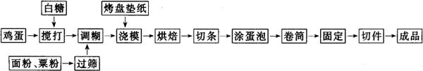 | 释义 | 代表品种的配方及制作工艺 (一)卷筒蛋糕 1.原料配方(kg) 配方1:鸡蛋10,白糖2.5,富强粉2,玉米淀粉0.5,奶油膏10,碎桃仁1(制奶油卷蛋糕)。 配方2:鸡蛋10,白糖6,富强粉2.5,玉米淀粉2.5,果酱5(制果酱蛋糕,另白糖留1/6g作外饰用)。 配方3:鸡蛋10,白糖6,富强粉9,蛋白膏13.5(制蛋白卷蛋糕)。 2.工艺流程