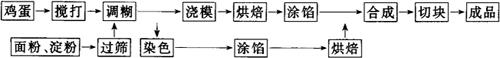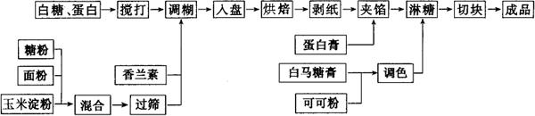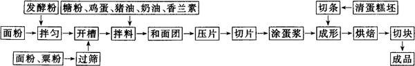3.制作方法 (1)制作糕坯 搅蛋浆、调糊与一般蛋糕相同。调好的蛋糊应放入垫纸的大烤盘内入炉烘焙,烘焙温度不宜太高。蛋糕坯烤熟后每盘分切成三条。 (2)叉烧肉加工调味 将叉烧肉切条,加入味精、白糖、植物油、潮州粉等调味料进行加工调味。 (3)制饼皮 饼皮的制法同“甘露酥皮”,按原料配方制成饼皮,然后切成与蛋卷长宽度相等的薄块。 (4)卷糕 切条后的蛋糕坯,每条分别卷入调味的叉烧肉,卷成蛋糕卷。 (5)烘焙 卷蛋糕还盖上饼皮,入炉烘焙,炉温火力应控制得稍低一些,防止烘焦,当饼皮黄熟即可出炉。 (6)切件 卷蛋糕烘焙好以后,出炉冷却,按规格切件即为成品。 4.质量要求 色泽金黄,入口香酥甜润。 (九)海绵夹心蛋糕 这种蛋糕是以蛋白和面粉、糖为主制成的,弹性特强。不含蛋黄、油脂成分,是理想的低胆固醇食品。 1.原料配方(kg) (1)蛋糕坯:鲜蛋白10,面粉3.3,玉米淀粉2.5,白糖5.6,白糖粉6,香兰素0.008。 (2)涂料:蛋白膏、白马糖膏、可可粉各适量(总量占蛋糕坯40%)。 2.工艺流程