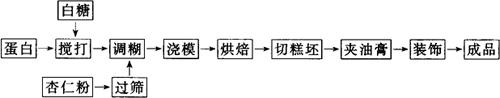 3.制作方法 (1)打蛋浆、调糊方法同清蛋糕。 (2)浇模 将调好的蛋糊分成两半,一半倒入刷好底油的烤盘中,摊平,即入炉烘焙。另一半蛋糊用胭脂红色素染成红色,再倒入另一个刷好底油的同样大小的烤盘内,摊平,入炉烘焙。 (3)烘焙 烤盘入炉烘焙,温度控制在180~200℃,以烤熟但不烤老为原则。 (4)涂馅 将烤好的糕坯脱模于干净的台板上,取奶油膏均匀涂刮于其中的一块糕面上。 (5)合成 将另一块未涂馅的糕坯,面朝上,底朝下,覆盖于奶油膏上并与其糕坯重合。于是三色糕坯合成。 (6)切块 将合成的糕坯,按要求的大小切成均匀的三角形状,即为成品。 4.质量要求 色泽美观,夹层分明,入口香甜软滑。 注:三色蛋糕的夹馅可以多种,如糖膏、豆沙、枣泥等,还有的三色蛋糕,中间不夹馅,而是把糕坯做成三色复合而成。 (四)鸳鸯蛋糕 其制作方法大体同三色蛋糕,所不同的是中间不夹馅为两色蛋糕。 (五)杏仁蛋糕 1.原料配方(kg) 蛋白10,白糖10,杏仁粉15(留5饰面用),奶油膏25,朗姆酒5。 2.工艺流程