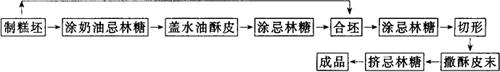 3.制作方法 (1)打蛋浆 蛋白和白糖入搅蛋机容器,充分搅拌打涨发至原体积2~3倍。 (2)调糊 将杏仁粉过筛,逐渐倒入搅打好的蛋白浆中(杏仁粉留1/3饰面用)调成均匀的蛋糊。 (3)浇模与烘焙 烤盘涂刷底油,舀蛋糊入盘摊平成薄层,然后入炉烘焙。炉温不宜太高,否则易烤焦,温度约在150℃,3~5min即成熟。 (4)切糕坯 把烘焙好的糕片膜出烤盘,切成规格要求的大小一致的正方形糕坯。 (5)夹油膏 每三片糕坯夹两层油膏,每层油膏厚约1cm。涂油膏时每层可喷雾一点朗姆酒,以增加浓郁的醇香味。油膏夹好以后,在糕面撒上杏仁粉,即为成品。 4.质量要求 糕坯呈黄褐色,滋润松软浓香,厚薄均匀,不断不碎,油膏有一定塑性,不软烂溶化,滋味润滑不腻,醇香浓郁。糕面干燥完整,四边齐整,无油膏流溢,层次清楚。 注:本蛋糕为高油、高蛋白质松脆性,宜冰冻食用。 (六)酥皮蛋糕 以清蛋糕为基础,外包甜酥皮,内夹清蛋糕坯,经烘焙成熟的一种夹馅蛋糕。 1.原料配方(kg) 清蛋糕坯:鸡蛋10,白糖4.5,富强粉4,淀粉0.5。 外酥皮:富强粉5,猪油2.4,奶油0.3,白糖2.7,鸡蛋1.2,发酵粉0.08,香兰素约0.05,栗粉0.8。 2.工艺流程
