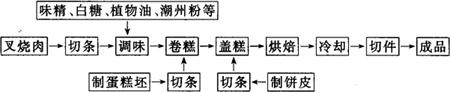 3.制作方法 (1)制蛋糕坯(制法同“奶油花蛋糕”)和制水油酥皮(制法同“蛋挞皮”)。 (2)将一盘蛋糕坯去掉底纸,涂一层奶油忌林糖后盖一层水油酥皮,又涂上奶油忌林糖一层。 (3)取另一盘糕坯盖压于前一涂忌林糖的糕坯上,再涂上一层奶油忌林糖。 (4)切块成形:蛋糕切成“日”字形,(在切前,一定要把糕坯与酥皮夹好,压严实才能切)把水油酥皮碎末撒在每件蛋糕两头中间,留下一些空余位置挤上奶油忌林糖。至此为成品。 4.质量要求 有软、滑、香、酥、化的特殊风味。 (八)叉烧甘露卷蛋糕 1.原料配方(kg) (1)蛋糕底:鸡蛋10,白糖4.5,富强粉4,粟粉0.5。 (2)饼皮:鸡蛋1.12,白糖4.4,富强粉5.4,猪油1.6,泡打粉100,香兰素适量,扫面蛋0.7。 (3)馅料:叉烧肉3.3,潮州粉1.35,植物油0.07,味精适量。 2.工艺流程