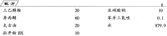 将三乙醇胺、异丙醇、太古油溶于528g水中,搅匀得混合溶液,再将拉开粉BX、亚硝酸钠和苯并三氮唑溶于剩余的水中,搅拌使固体全部溶解后倒入刚才所制得的溶液中,充分搅拌均匀,即得成品。