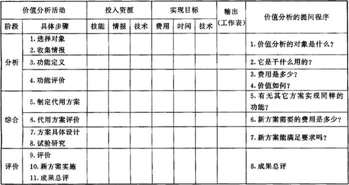 开展价值分析活动,就是发现问题、解决问题的过程,如对所要研究的系统,逐步深入地提出一系列问题,并为这些问题寻找答案,促使问题圆满解决。一般的提问是:(1)价值分析的对象是什么?(2)它是干什么用的?(3)费用是多少?(4)价值如何?(5)有无其它方案能实现同样的功能?(6)新方案需要的费用是多少?(7)新方案能满足要求吗?(8)成果总评方法。