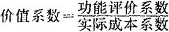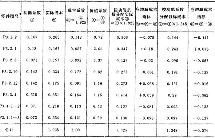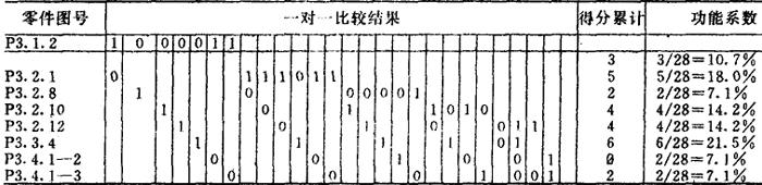 计算结果:2.7分钟为单件平均消耗工时分。 统计资料表明,16种零件占零件总数的13%,需占用总工时的32.33%%;87%的零件低于平均工时,占总工时的67.67%。这16个项目在工时消耗上虽然还不能说是关键的少数,但主要功能零件项目都包括在内。因此,确定8种零件作为价值分析的对象。这8种零件既是主要功能零件,又属于单件消耗工时较高的双因素零件。 二、评价功能,计算功能评价系数 在功能分析基础上,由熟悉该组件的技术人员,采用“强制确定法”(FD),把上述零件排列起来,进行一对一地打分比较。然后把每个零件的累计得分,除以全部零件得分总和,求出每只零件的功能评价系数(见表3)。 表3 功能评价系数统计表