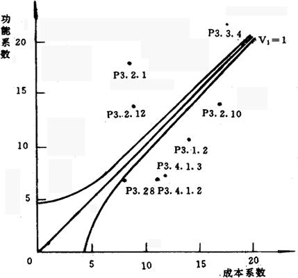 实际成本系数-零(部)件的实际成本占全部零(部)件实际成本的比重。 3.确定目标成本,进行分配 确定比原成本降低30%的目标成本(见表4)。 4.选取(1/2(X2-Y2)=10为最合适区域绘制曲线,打点观察分析(见下图)。