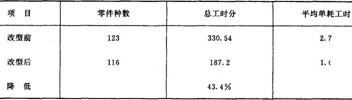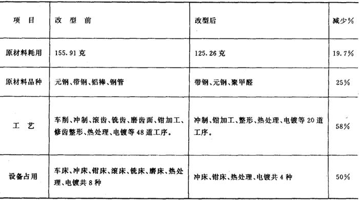 根据表2数值及在曲线图上偏离原点距离情况,评价分析如下: (1)价值系数<1的零件有P3.1.2、P3.2.8、P3.2.10、P3.4.1-2、P3.4.1-3共五种。说明对它们分配了过多的实际成本,应设法降低成本。 (2)价值系数>1的有P3.2.1、P3.2.12、P3.3.4,其中P3.2.12、P3.34的价值系数虽略>1,由于主要功能件其成本分配尚属合理,故排除考虑。对P3.2.1应研究实际成本分配是否偏少,分析后认为,该件成本分配偏低的主要原因,是因为采用了较简单的冲制工艺,工时消耗较低。 综上分析,确定以P3.2.12传动锥齿轮,P3.2.10传动轴齿轮,P3.1.2色带传动锥齿轮,P3.4.1-2色带盘芯,P3.4.1-3色带盘轴为价值分析的主要对象。 四、分析研究,提出设想,确定方案 确定了主攻对象后,组织广大技术干部及工人,发挥集体智慧和力量,经过相当一段时间的工作,提出各种不同设想和方案。但从优质低耗双因素目标对比看,经济效果最显着的一个方案,是要彻底摆脱原齿轮传动机构而改用连杆传动型机构。它的优点是简化了结构,削减了工序和加工工时,可以将齿轮传动机构中有关齿轮、离合器、轴芯、轴盘等加工复杂的零件,改为较简单的冲制工艺加工的零件。以P3.1.2合件为例,原加工要经过车、铣、钻、钳等10道工序,单件工时为8.4分钟,改用冲制工艺只需8道工序,单件工时消耗仅1.3分钟。这样,制造成本将显着降低。 但是,连杆传动机构能否达到原齿轮传动机构的使用功能,尚需作对比分析。从传动机构原理上看,用齿轮具有平滑、稳定、均匀和轻巧的优点。当然比连杆传动机构为佳。但再进一步从整台打字机使用性能要求冲击、间隙状态工作。色带架组件完成色带传动和换向等动作过程,也是如此配合工作的。因此,若认为采用连杆传动机构的设想方案降低了传动性能(功能)的话,还不如说原齿轮传动机构的功能是大大的过剩。换言之,连杆传动机构功能完全可以代替齿轮传动机构的必要功能。最后,一致确认改用连杆传动机构为最佳方案。 五、组织试制、验证及实施 在统一认识上述方案的基础上,组织技术人员另行设计色带架组件。通过小样试制,批量投产考核(包括设计、加工工艺、各项消耗定额、工艺装备等考核),证明该方案是可取的。比如,原齿轮传动结构中几对金属齿轮要靠加工精度、啮合程度及一定强度来保证,要求较高。改用连杆传动后,取消了作为主功能的金属齿轮零件。虽然在新的结构中仍需保留一对必要齿轮,但对其降低了功能要求(只起到撑牙作用),并改用聚甲醛塑料注塑成型。改型后的色带架组件经装上整机试用验证,不仅功能不变,而且可与国际规格通用,从而提高了价值功能。 最后,经厂部批准,修改了全部技术资料,组织新的投料。1981年开始实施。 六、经济效果分析 由于主要功能件结构改型,带动了整个色带架组件成本构成的变化,效果较为显着(见表5、表6、7、表8)。 表5 主要功能零件改型前后材料、工艺、设备对比表