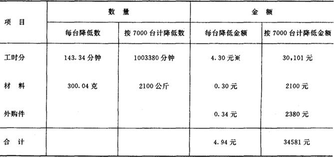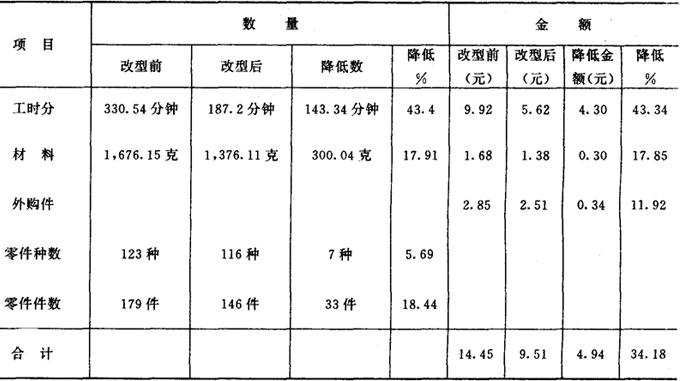 PS型外文打字机原每台成本为280元。通过价值分析(VA)改进色带架设计结构后,每台成本预计为275.06元,总成本降低1.8%。降低部分仅仅计算工时消耗、材料消耗及外购件三项可变因素,至于设备占用费等变化尚未统计在内。 |