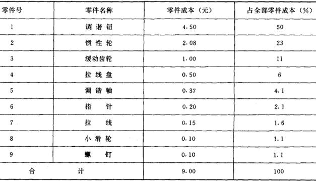 | 释义 | 价值工程在T4800型收音机调谐系统中的应用 T4800型落地式半导体收音机的调谐系统有9个零件,每个零件的成本见表1: 表1