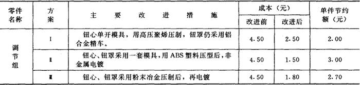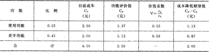 从表中看出,调谐钮和惯性轮两件的成本占了全部零件成本的73%,应作为价值工程的重点对象。 惯性轮功能的成本,就是零件目前的成本2.08元。其成本构成为:工时费1.50元,材料费0.51元,电镀费0.07元,合计2.08元。 改进方案采用粉末冶金压制工艺,代替原来的车削加工。新工艺模具制造较简单,原材料可选用钢材的下脚料——氧化鳞皮。惯性轮的净重只有155克,而原工艺的毛重为500克,所以,节省大量钢材。还采用蒸气法来代替表面电镀,零件一次成型精度高。用这种方法促进了零件的标准化,可用于厂内今后生产的各种大型台式机。 用经验估算法,初步估算出新方案的最低成本为0.84元(包括模具费、材料费、加工费和包装费),也即功能评价值。成本降低的期望值C0-Ca=2.08-0.84=1.24元,成本下降约60%。 调谐钮的美学功能不容忽视。T4800机箱造型雅致大方,如果调谐钮的光洁度不够、精度不高的话,将使整个箱体外观逊色。经多次研究,决定按0.55∶0.45的比例来分摊目前成本。即使用功能成本为2.50元,美学功能成本为2.00元。 根据T4800收音机的出厂价,零售价与目前小批投产成本差距太大的现实情况,参考国内同类型机的成本,确定目标成本为2.50元。成本的分配情况见表2: