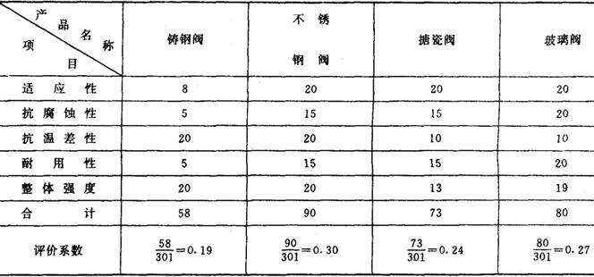 按照功能系统图,在保证阀门原有的密封好、强度高的技术质量参数的前提下,主要抓住了适应广、寿命长两个功能参数的提高与改善。具体作法: (一)在阀门的主要结构件——“阀体”的内壁上全部衬上了一层5mm的玻璃层。由于玻璃不与腐蚀性介质发生化学反应,阀门就不会产生锈蚀,这样,既保持了阀门原有的强度,又极大地提高了阀门的防腐蚀能力。 (二)正确处理产品功能与产品成本的关系,是评价产品价值大小的依据。根据价值工程的基本表达公式: 按照价值工程的原理和方法。对工作压力为6kgf/cm2,工作温度在-30℃到-160℃范围内的腐蚀性工作介质的管理上,广泛采用的口径同为50mm的铸铜阀(Z41BL-6)四种不同材质和结构的阀门。依照产品的适应性、抗腐蚀性、抗温差性、耐用性和整体强度五个功能项目的高低程度,进行评价打分,然后用加权平均法计算各种阀门的功能评价系数(见表1)。 表1 功能评价系数表