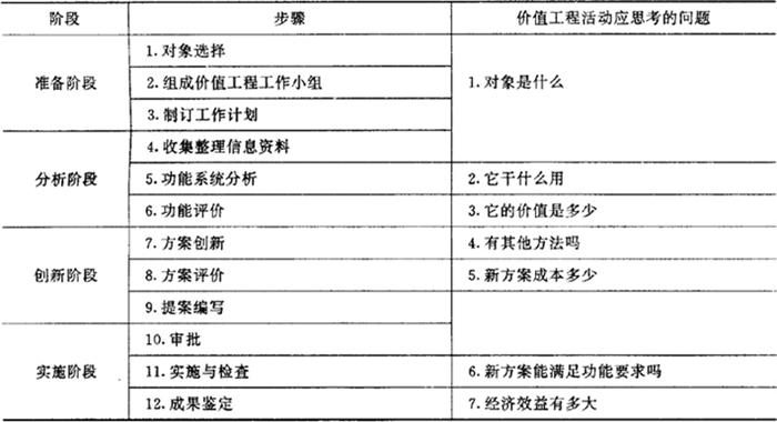 | 释义 | 价值工程的一般工作程序 根据价值工程分析目标的不同,开展活动的程序与步骤也不尽相同。一般的具体步骤以及思考的问题可归纳如表5.1.3-1完成表中所列各步,一般地说,价值工程的工作就基本结束。但实际工作中各步也可以灵活安排。目前,有许多企业,还把价值工程与质量管理结合起来进行。 表5.1.3-1 价值工程的一般工作程序
