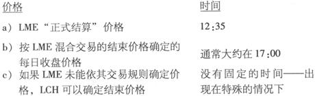 | 释义 | 价格的使用 LME的规则具体规定了价格的建立、将其提交给LCH的时间以及万一LME未能这样做时,LCH可确定价格的时间。 用于计算保证金的价格一般是a)和b),特殊情况下可能会是c)。这些价格所使用的都是用合约的主要标价货币。
