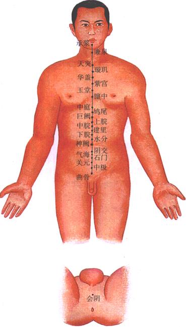 会阴Huìyīn(RN 1) 【定位】 在会阴部,男性当阴囊根部与肛门连线的中点处;女性当大阴唇后联合与肛门连线的中点处。 【主治】 昏迷,癫狂,小便不利,痔疾,遗精,阳痿,脱肛,月经不调。 【操作】 直刺0.5~1寸;孕妇慎用。 曲骨Qūgǔ(RN 2) 【定位】 在下腹部,当前正中线上,耻骨联合上缘中点处。 【主治】 少腹胀满,小便淋漓,遗尿,遗精,阳痿,月经不调,痛经,赤白带下。 【操作】 直刺0.5~1寸;孕妇慎用。 中极Zhōngjí(RN 3) 【定位】 在下腹部,前正中线上,当脐中下4寸。 【主治】 癃闭,遗尿,小便不利,遗精,阳痿,月经不调,崩漏,阴挺,产后恶露不止,带下。 【操作】 直刺1~1.5寸;孕妇慎用。 关元Guānyuán(RN 4) 【定位】 在下腹部,前正中线上,当脐中下3寸。 【主治】 少腹疼痛,腹泻,痢疾,脱肛,疝气,尿闭,尿频,遗精,阳痿,月经不调,痛经,经闭,崩漏,带下,不孕,阴挺,恶露不尽,胞衣不下。 【操作】 直刺1~2寸;多用灸法。孕妇慎用。 石门Shímén(RN 5) 【定位】 在下腹部,前正中线上,当脐中下2寸。 【主治】 腹胀,腹泻,痢疾,腹痛,水肿,疝气,小便不利,遗精,阳痿,经闭,带下,崩漏,产后恶露不止。 【操作】 直刺1~2寸;孕妇慎用。 气海Qìhǎi(RN 6) 【定位】 在下腹部,前正中线上,当脐中下1.5寸。 【主治】 腹痛,腹泻,痢疾,便秘,小便不利,遗尿,遗精,阳痿,疝气,月经不调,痛经,经闭,虚脱。 【操作】 直刺1~2寸;多用灸法。孕妇慎用。 阴交Yīnjiāo(RN 7) 【定位】 在下腹部,前正中线上,当脐中下1寸。 【主治】 腹痛,水肿,疝气,小便不利,月经不调,带下。 【操作】 直刺1~2寸。孕妇慎用。 神阙Shénquè(RN 8) 【定位】 在腹中部,脐中央。 【主治】 腹痛,腹胀,腹泻,痢疾,便秘,脱肛,水肿,虚脱。 【操作】 一般不针,多用艾条或艾炷隔盐灸法。 水分Shuǐfēn(RN 9) 【定位】 在上腹部,前正中线上,当脐中上1寸。 【主治】 水肿,小便不利,腹痛,腹泻,胃反吐食。 【操作】 直刺1~2寸;水病多用灸法。 下脘Xiàwǎn(RN 10) 【定位】 在上腹部,前正中线上,当脐中上2寸。 【主治】 腹痛,腹胀,腹泻,呕吐,食谷不化,虚肿,消瘦。 【操作】 直刺1~2寸。可灸。 建里Jiànlǐ(RN 11) 【定位】 在上腹部,前正中线上,当脐中上3寸。 【主治】 胃痛,呕吐,食欲不振,腹胀,腹痛,水肿。 【操作】 直刺1~1.5寸。 中脘Zhōngwǎn(RN 12) 【定位】 在上腹部,前正中线上,当脐中上4寸。 【主治】 胃痛,呕吐,吞酸,腹胀,腹泻,痢疾,呃逆,黄疸,咳喘痰多,癫狂,失眠。 【操作】 直刺1~1.5寸。 上脘Shàngwǎn(RN 13) 【定位】 在上腹部,前正中线上,当脐中上5寸。 【主治】 胃痛,呕吐,呃逆,腹胀,吞酸,食不化,癫癎。 【操作】 直刺1~1.5寸。 巨阙Jùquè(RN 14) 【定位】 在上腹部,前正中线上,当脐中上6寸。 【主治】 癫狂癎,胸痛,心悸,胃痛,呕吐,吞酸。 【操作】 向下斜刺0.5~1寸;不可深刺,以免伤及肝脏。 鸠尾Jiūwěi(RN 15) 【定位】 在上腹部,前正中线上,当胸剑结合部下1寸。 【主治】 癫狂癎,胸满,心悸,心痛,腹胀,呕吐。 【操作】 向下斜刺0.4~0.6寸。 中庭Zhōngtíng(RN 16) 【定位】 在胸部,当前正中线上,平第5肋间隙,即胸剑结合部。 【主治】 胸胁胀满,噎嗝,呕吐,小儿吐乳,心痛,梅核气。 【操作】 平刺0.3~0.5寸。 膻中Shānzhōng(RN 17) 【定位】 在胸部,当前正中线上,平第4肋间隙,两乳头连线的中点。 【主治】 咳嗽,气喘,胸闷,心悸,呃逆,产后乳少。 【操作】 平刺0.3~0.5寸。 玉堂Yùtáng(RN 18) 【定位】 在胸部,当前正中线上,平第3肋间隙。 【主治】 咳嗽,气喘,胸闷,胸痛,乳房胀痛,呕吐。 【操作】 平刺0.3~0.5寸。 紫宫Zǐgōng(RN 19) 【定位】 在胸部,当前正中线上,平第2肋间隙。 【主治】 咳嗽,气喘,胸痛。 【操作】 平刺0.3~0.5寸。 华盖Huágài(RN 20) 【定位】 在胸部,当前正中线上,平第1肋间隙。 【主治】 咳嗽,气喘,胸胁胀痛,咽喉肿痛。 【操作】 平刺0.3~0.5寸。 璇玑Xuánjī(RN 21) 【定位】 在胸部,当前正中线上,天突下1寸。 【主治】 咳嗽,气喘,胸痛,咽喉肿痛,胃中积滞。 【操作】 平刺0.3~0.5寸。 天突Tiāntū(RN 22) 【定位】 在颈部,当前正中线上,胸骨上窝正中。 【主治】 咳嗽,气喘,胸痛,咽喉肿痛,暴喑,瘿气,梅核气,噎嗝。 【操作】 先直刺0.2~0.3寸,然后将针尖向下,紧靠胸骨柄后方刺入0.5~1寸。必须严格掌握针刺的角度和深度,以防刺伤肺和有关动、静脉。 廉泉Liánquán(RN 23) 【定位】 在颈部,当前正中线上,喉结上方,舌骨上缘凹陷处。 【主治】 舌强不语,暴喑,吞咽困难,舌缓流涎,口舌生疮,咽喉肿痛。 【操作】 向舌根斜刺0.5~0.8寸。 承浆Chéngjiāng(RN 24) 【定位】 在面部,当颏唇沟的正中凹陷处。 【主治】 口,齿龈肿痛,流涎,暴喑,口舌生疮,癫狂。 【操作】 斜刺0.3~0.5寸。 弯针及其处理 进针时或将针刺入腧穴后,针身弯曲,针柄改变了进针时的方向和角度,伴有提插、捻转及出针困难,或患者感觉疼痛为弯针。 轻度弯针,可按一般出针法将针慢慢地退出;若针身弯曲较大,应注意针弯的方向,顺着弯曲方向将针退出。 |