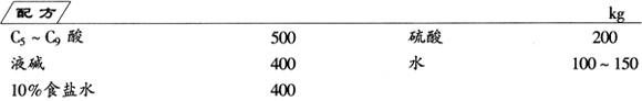 (1)酸化 在夹套反应釜中加入500kg C5~C9酸后,开动搅拌,在搅拌中以点滴细流加入硫酸200kg,控制在2h内加完。加硫酸时,C5~C9酸的温度应始终控制在30~34℃。夏天可在夹套内通冷却水,冬天通少量蒸汽控制反应温度。搅拌反应10h后,再静置12h。
