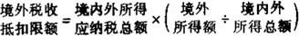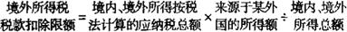 上式中,“境内外所得应纳税总额”包括境内外的所得按企业所得税税率30%和按地方所得税税率3%计算的应纳税总额。 已在境外缴纳的所得税税款,是指外商投资企业就来源于中国境外的所得在境外实际缴纳的所得税税款,不包括纳税后又得到补偿或者由他人代为承担的税款。 所说的境外所得依照本法规定计算的应纳税额,是指外商投资企业的境外所得,依照税法和本细则的有关规定扣除为取得该项所得所应摊计的成本、费用以及损失,得出应纳税所得额后计算的应纳税额。该应纳税额即为扣除限额,应当分国不分项计算,其计算公式如下: