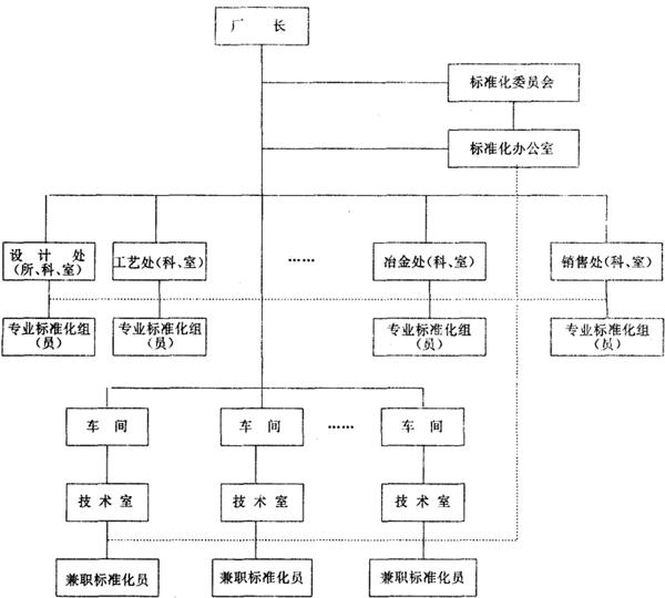 | 释义 | 企业标准化工作系统的合理结构形式 1.现有的组织形式及存在问题 由于我国企业的专业性质、规模大小、产品复杂程度、建厂时间长短、企业素质和标准化意识等等的不同,企业标准化工作系统的组织形式差异甚大。归纳起来,主要有如下几种组织形式。 (1)集中制 即企业集中设立标准化处(科、室)与其它职能部门平行,直属总工程师或厂长领导,统管全企业的标准化工作。其优点能统筹规划企业的标准化工作,利于全面管理,能充分发挥标准化专业队伍的作用,便于在总工程师或厂长管辖下对各业务部门生产技术活动管理监督。其缺点是标准化专职机构“高高在上”,和企业内各职能部门业务往来不密切,不易开展业务工作。 (2)分散制 即企业不设总的标准化机构,而在职能部门分别设置标准化工作机构,隶属该部门负责人领导。其优点是开展本部门业务范围内的标准化工作比较方便,但由于没有集中领导管理,易发生各自为政,互不协调的现象,甚至出现不必要的重复,造成人力和物力的浪费。 (3)混合制 即企业设置总的标准化机构,直属总工程师或厂长领导,同时又在各主要职能部门分别设立标准化分支机构,以从事各部门的标准化工作,行政上归本部门领导,业务上由总的标准化机构统一协调归口。这种型式既有集中制的优点又有分散制的优点。其缺点占用专职人员较多,由于各标准化分支机构在行政上不归总的标准化机构领导,往往业务上也出现不协调和不易归口协调的局面。这种形式是我国大中型企业普遍采用的一种组织形式。 (4)标准化委员会 这是我国近几年出现的一种新的企业标准化工作机构。它以厂长为首,由企业设计、工艺、生产、质量、销售、供应、财务、企业管理办公室、定额、劳动工资等部门的负责人组成。它的主要任务是对企业标准化的重大问题,如规划、计划、重要标准的制修订等进行讨论、审议和决策,决定后再由标准化职能部门去贯彻实施。这种型式由于是厂长和企业各部门主要负责人直接参与,有利于推行企业标准化工作。其组织形式的功能发挥有赖于企业领导和各部门负责人的标准化意识,意识强,能充分发挥其作用;意识淡薄,往往因为他们自身业务工作忙,而使其流于形式。 2.企业标准化工作系统的合理结构形式 根据《GB/T15496-1995企业标准化工作指南》第5.1条推荐的企业标准化机构的形式,按照企业标准化工作系统组织“六原则”,我们在充分认识现行企业标准化组织形式利弊的前提下,不难探索建立企业标准化工作系统的合理结构形式。该结构形式如图10.3-1所示。