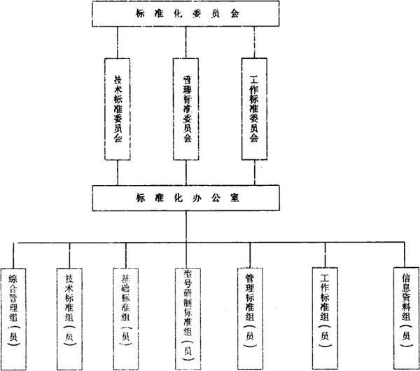 图1 0.3-2 企业标准化委员会和标准化办公室组织形式图 本结构形式首先体现了以厂长为核心领导的“集中原则”,能体现标准化工作的高度集中统一。工厂标准化委员会主任由厂长兼任,副厂长、总工程师为副主任,各职能部门和主要车间的负责人为委员(他们都应是企业标准化意识较强的人),标准化办公室(或工厂标准化归口中心机构)负责人为委员会秘书长。在标准化委员会下面设立常设的、精干的专职标准化办事机构,在标准化委员会休会期间负责处理日常事务。考虑到我国企业现行体制的特点,标准化办公室既是标准化委员会的常设机构;又是厂长直接领导下的行政业务管理机构。为进一步体现企业标准化工作系统的组织“网络原则”、“分工原则”、“反馈原则”,还应在各职能业务部门设立精干的专业标准化机构和车间兼职的标准化人员,以负责本部门的标准化业务工作。这里之所以强调在企业内专业较强的业务部门分散设置专职标准化机构,主要吸取美、英等国和我国“分散制”组织型式的优点,以及根据多年来我国企业标准化工作的实践,权衡开展专业性较强的业务部门的标准化工作的利弊而提出的。且这些部门的专、兼职标准化机构或人员在业务上都归标准化委员会下面的标准化办公室领导,其行政上虽不直接归标准化委员会领导,但实际上由于标准化委员会的委员们都是各部门的负责人,标准化委员会对各部门的专、兼职标准化人员都有一定的行政管辖力和约束力。这样的组织结构能较好地体现企业标准化工作系统的组织六原则,并能充分发挥企业标准化系统管理的组织功能,即有效地运用组织机构发挥标准化专职人员和全员的聪明才智,深入挖掘标准化的“潜能技术”、“技术再创造”的潜力,体现综合的意志和力量,园满地实现企业标准化的目标管理。 图10.3-1是为我国大中型企业设想的标准化工作系统结构方案。我们可以认为,以厂长为领导的企业标准化委员会就是企业标准化的“总体设计部”,标准化办公室则是总体设计部的参谋、联络、监控、综合办事机构,通过它使企业标准化的纵横网络协调一致,运转自如。 图10.3-2是企业标准化委员会和标准化办公室的具体组织方案。委员会根据企业标准系统中的“三大”分系统(见本章第三节)设置三个分委员会。鉴于企业标准化委员会成员主要是企业内各职能部门负责人,他们按各自职能参与有关分委员会。如总工程师系统的部门负责人应是技术标准委员会成员;总经济师系统、企管办、全质办的部门负责人应是管理标准委员会成员;人事、劳资、行政系统的部门负责人则应是工作标准委员会成员。这样能较好的做到各司其职,有利于企业标准化工作的开展。 标准化办公室是企业标准化委员会的常设机构,也是企业标准化的专职机构。该机构的建立是企业标准化工作系统的核心部分,也是关键部分。这个标准化办公室的机构设置与当前我国企业标准化的专职机构设置大不相同,其主要特点是用系统工程管理企业标准化工作。标准化办公室下设的若干专业组织就是这个工作系统核心部分的若干分系统。 《综合管理组》的职责主要是负责企业标准体系和体系表的研究与制定;产品综合标准化方案的研究与制定;企业标准化的发展规划和年度计划的研究与制定;以及负责协调、统一企业各职能部门所设立的专业标准化机构、兼职标准化人员之间的工作。 《技术标准组》的职责主要是负责制定和贯彻实施除基础标准组、型号研制标准组所管辖范围以外的所有其它技术标准。其管辖的类型比较全面,而且既管制定,又管贯彻。便于总结企业中因处理大量发生的贯彻标准问题而积累起来的经验教训,反馈到标准制定中去,并把这些信息传递给其它标准组,提高标准制定水平。避免盲目制定标准而不顾如何贯彻实施的弊病。 《基础标准组》的职责主要是负责基础标准的制定与贯彻实施。因为一般基础标准为各类专业标准所公用,全企业需要统一管理起来,以体现基础标准的高度集中与统一。 《型号(产品)研制标准组》的职责主要是负责型号研制全过程的标准化工作。在标准化办公室内之所以设置这一专业组,主要考虑在企业标准化领域内,型号(产品)标准系统是技术标准系统的“龙头”,占有相当大的比重,设置这个专业组可保证型号研制全过程的标准化工作,以便更好地开创企业标准化工作的新局面。 《管理标准组》的职责主要是负责研究和建立管理标准系统,制定和贯彻实施管理标准。 《工作标准组》的职责主要是负责研究和建立工作标准系统,制定和贯彻实施工作标准。 设置管理标准组和工作标准组是为了建立完善的企业标准系统,这也正是现今我国企业标准化机构设置所缺少和忽视的部分。 《信息资料组》的职责主要是负责标准信息资料的收集、整理分析、保管、查询、发放以及标准贯彻中的信息反馈等,应在企业中起到标准化信息站的作用。以往我国企业标准化专职机构对这项工作不够重视,仅让企业档案馆或综合情报资料室代管标准化情报信息。未能认识标准化事业的发展在一定程度上取决于标准情报信息工作开展的好坏,取决于对标准信息资料的利用率和吸收速度。因此,企业标准化专职机构必须设置标准信息专门机构来负责开展此项工作。随着计算机现