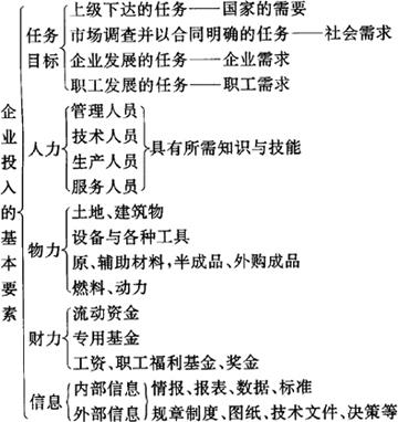 | 释义 | 企业生产经营的理论模式 理论模式描述企业经营的外部环境,以及企业内部生产经营活动的运行与决策过程。 外部环境主要是指国家政策法令、国家计划的指导、顾客用户和市场需求、资源可获得性、技术基础与水平、竞争者的行为、社会义务及社会的价值观等。 企业要十分重视考虑影响自身经营的外部因素。这些因素是企业决策中的不可控变量,在研究时将它们作为一个前提,有时则需要将一些变量抽掉,而集中研究另一些变量的联系。虽然在后面我们研究企业生产经营活动的运行决策中没有能够对所有环境约束都直接涉及到,但这并不是说这些约束就不存在,只是为了简化理论上的研究。当我们将抽象出的理论模式应用于实际时,就必须将这些环境因素及约束条件加进去,做出切合实际的决策。 企业内部生产经营活动的运行与决策是指经营决策,生产投入,投入的转化过程,产品的产出及市场销售。投入的基本要素的构成如图1.2.4-1所示。