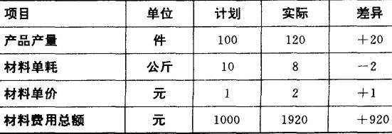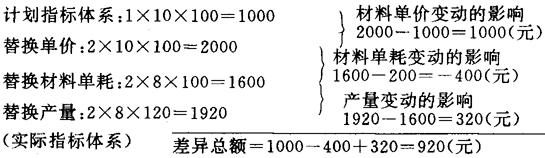 将上述两种替换顺序的结果进行比较,可以看出差异总额不变,都是920元,但是各种因素的影响程度却不同了。在第二种替代情况下,因材料单价变动影响而增加1000元,材料单耗变动影响减少400元,产量变动影响增加320元。为什么替换顺序不同,各因素影响的程度不样一呢?其原因是替换顺序变动后,所依据的其他因素发生了变化,所以计算的结果也就不同。例如,在第一种替换顺序情况下,产量变动的影响是在计划单价和计划单耗的基础上计算的: