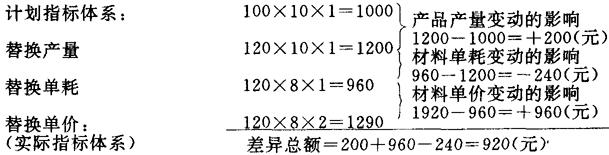 从图表中的资料可以看出,实际材料费用总额比计划数额超支920元。影响材料费用总额变动的因素有三个方面:一是产量的增加;二是单位产品材料消耗量降低;三是材料单价的上涨。 在采用连环替代法时,以计划指标体系为基础,按着各因素之间的依存关系,确定替代顺序,每次替换一个,直到全部替换成实际因素时为止。这样,相邻两个指标的差异就是此次替代因素所影响的结果。具体计算过程如下: