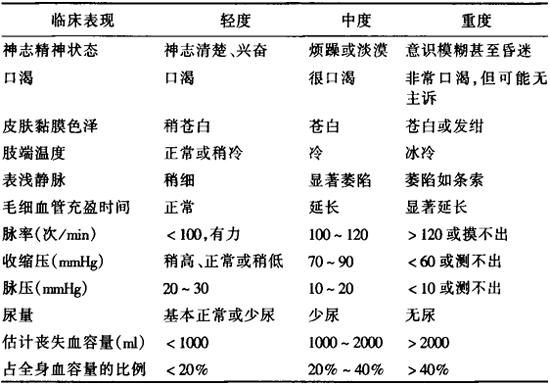 | 释义 | 休克 休克是人体对有效循环血量锐减的反应,是组织血液灌注不足所引起的代谢障碍和细胞受损的病理过程。通常根据病因将休克分为低血容量性休克、感染性休克、心源性休克、神经源性休克和过敏性休克。其中低血容量性休克和感染性休克是外科最常见的两种休克。休克的出现表明患者的病情已十分危重,如不积极治疗则常在短时间内导致机体重要脏器和代谢功能的衰竭,以致患者死亡。在外科临床工作中,早期发现休克、密切监测病情变化和积极有效的治疗,是提高抗休克疗效、降低病死率的关键。 【诊断要点】 1.病史:常有严重创伤、大出血、严重脱水、重度感染、药物过敏等病史。 2.神志精神状态:早期兴奋,烦躁不安,继而出现神志淡漠、意识模糊,晚期出现昏迷。 3.皮肤及末梢循环:面色苍白,四肢湿冷,表浅静脉萎陷,甲床充盈延迟。 4.脉搏:早期脉搏加快有力,继之脉搏细速、微弱甚至摸不清。 5.血压:早期收缩压正常,舒张压升高,脉压差缩小(<20mmHg),继而收缩压下降(<90mmHg),脉压差更趋缩小[高血压患者收缩压可>(12.0kPa)90mmHg,但较基础值下降20%以上]。 6.尿液:尿量减少(<20ml/h),尿相对密度(下作比重)增高。 7.血常规检查:如红细胞计数及血红蛋白升高,表明血液浓缩,容量不足;白细胞计数和中性粒细胞计数在各型休克中均有增高。红细胞比容(压积)>45%为血液浓缩,<35%为血液稀释,但在失血性休克时早期下降可不明显。血小板计数、凝血酶原时间、纤维蛋白原含量及鱼精蛋白附凝试验等检查有助于休克并发DIC的诊断。 8.休克程度的判断:对休克患者,应判断其程度,以指导治疗(表1-1)。 表1-1 休克程度的判断