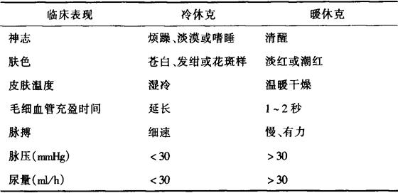 9.感染性休克:严重感染患者出现寒颤,兴奋烦躁,体温突然升高达39℃以上,或突然下降到36℃以下,常伴有过度通气,表明休克即将发生。感染性休克可分为:①冷休克(低排高阻型),较为常见,多见于革兰阴性杆菌感染;②暖休克(高排低阻型),少见,多见于革兰阳性细菌感染所致休克的早期。这两种类型休克的临床表现见表1-2。 表1-2 两种感染性休克的临床表现