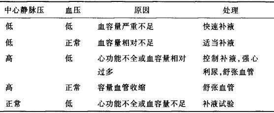 【监测项目】 1.一般监测 (1)神志精神状态:反映脑组织灌注状况。治疗后患者神志清楚,反应良好,表明血容量已恢复。患者烦躁、神志淡漠、头晕、眼花或出现体位性晕厥,多表示血容量仍然不足,休克依然存在。 (2)皮肤温度色泽:是反映休克时周围组织灌注情况的指标。如四肢温暖,皮肤干燥,指压甲床或口唇时,局部暂时呈苍白色,松压后迅速转红润,表明休克好转。反之亦然。 (3)血压:动态监测血压变化是估计休克程度和评价治疗效果的最重要指标之一。如治疗后血压回升,脉压差增大,表明休克好转。 (4)脉搏:休克时脉搏细速常出现在血压下降之前。有时血压虽然较低,但脉搏减慢而有力,四肢温暖,表示休克趋于好转。 (5)休克指数:为脉率与收缩压的比值。指数为0.5,表示无休克;指数>1,表示休克存在;指数>2,表示严重休克。 (6)尿量和尿比重:尿量>30ml/h,表明休克好转;尿量<25ml/h,比重增加,表明血容量不足;如<25ml/h,比重下降,提示可能已发生急性肾衰竭。 2.特殊监测 (1)中心静脉压(CVP):正常值为0.6~1.2kPa(6~12cmH2O),持续监测有助于判断病情。休克低血压时CVP<0.5kPa(5cmH2O),表明血容量不足;CVP>1.5kPa(15cmH2O),提示心功能不全或容量血管过度收缩;CVP>2.0kPa(20cmH2O),表明充血性心力衰竭。 (2)血气分析:可了解休克时肺功能和酸碱平衡情况。动脉血氧分压(PaO2)正常值为10~13kPa(75~100mmHg),二氧化碳分压(PaCO2)正常值为5.3kPa(40mmHg),动脉血pH值为7.35~7.45。休克时由于过度通气,PaCO2一般都较低或在正常范围内。PaCO2升高,而通气良好时,多提示肺功能不全。PaO2低于8.0kPa(60mmHg),吸入高浓度氧后仍难纠正,常提示呼吸窘迫综合征的存在。 (3)心电图监测:可了解心肌受损情况。 【处理】 1.一般措施 (1)尽快控制活动性大出血,保持呼吸道通畅,并予吸氧。 (2)询问病史,监测生命体征,对休克的病因和程度作出初步估计。 (3)取仰卧位,头部和躯干抬高15°,下肢抬高20°,保暖,适当止痛,保持安静,避免搬动。 (4)放置中心静脉导管,测定CVP,并予输液、输血,扩充血容量。 (5)留置导尿管,记录每小时尿量。 (6)留取血标本,作血常规、血培养、动脉血血气分析,并作血型鉴定和交叉配血试验。 2.补充血容量 (1)输液通路建立:应用粗针头,作多路静脉输液,中心和周围静脉并用以保证输液通畅和便于静脉给药,创伤患者应避免采用有可能已被损伤的静脉。 (2)输液类型选择:先输入晶体溶液(平衡盐溶液或0.9%氯化钠注射液)以扩充血容量,输入1500~2000ml后,应及时输入胶体液,如各种代血浆或全血、血浆、白蛋白。失血性休克可输入全血,其他类型休克可输入代血浆或血浆。胶体和晶体的用量比例为1∶3或1∶4。 (3)输液量和速度:应根据病情和输液后心率、血压、尿量的变化估计输液量和速度。但一般估计量常较实际偏低,特别是在严重休克时,需适当超量补液,才能恢复正常的血流动力。必要时可参照CVP的变化调节输液量和速度,见表1-3。 表1-3 输液量和速度的调节