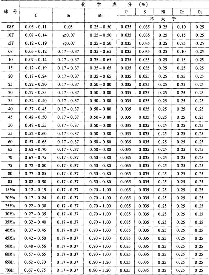 | 释义 | 优质碳素结构钢 优质碳素结构钢中S、P杂质含量比普通碳素结构钢的低,其中S≤0.035%,P≤0.035%。其化学成分如表2-2-5所示,力学性能如表2-2-6所示。 表2-2-5 优质碳素结构钢化学成分(GB699-88)