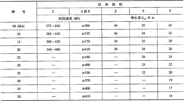 3.技术要求 (1)钢的牌号和化学成分 1)钢的牌号 08、08A1、10、15、20、25、30、35、40、45、50。 经供需双方协商可供应其他牌号。 2)化学成分(熔炼分析) 各牌号化学成分应符合GB/T 699的规定。在保证性能的前提下,08、08Al牌号的热轧钢板和钢带的碳、锰含量下限不限,08Al酸溶铝含量为0.015%~0.060%。 3)钢的成品化学成分允许偏差应按GB/T 222的规定。 (2)力学性能 热轧状态下钢板和钢带的力学性能按表5-61规定。经供需双方协商,可对表5-60中的性能指标进行调整。 表5-61 拉伸性能