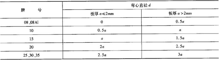 (3)弯曲试验 用08、08Al、10、15、20、25、30、35号钢轧制的钢板和钢带,在交货状态下应进行180°横向弯曲试验,弯心直径符合表5-62规定。弯曲处不得有裂纹、裂口和分层。 表5-62 弯曲试验