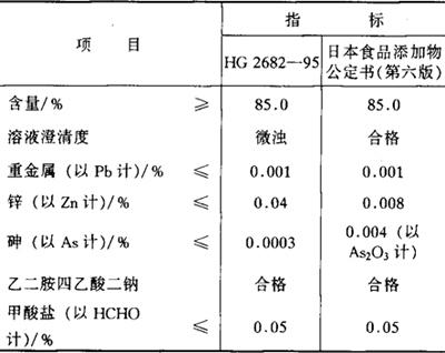 鉴别方法 (1)取本品水溶液(1+100)10mL,加硫酸铜溶液(1+20)2mL,显灰黑色。 (2)取本品水溶液(1+100)10mL,加高锰酸钾溶液(1+300)1mL,溶液的颜色立即消失。 (3)本品呈现钠盐反应,参见氢氧化钠鉴别方法。 毒理学依据 1.LD50 兔口服600~700mg/kg(bw)(以SO2计)。 2.ADI 0~0.7mg/kg(bw)(二氧化硫和亚硫酸盐的类别ADI,以二氧化硫计。FAO/WHO,1994)。 使用 漂白剂、防腐剂、抗氧化剂。 1.使用注意事项 参见亚硫酸钠。 2.使用范围及使用量 我国《食品添加剂使用卫生标准》(GB 2760-1996)规定:蜜饯、干果、干菜、粉丝、葡萄糖、食糖、冰糖、饴糖、糖果、液体葡萄糖、竹笋、蘑菇及蘑菇罐头,最大用量0.40g/kg。残留量以二氧化硫计,竹笋、蘑菇及蘑菇罐头不得超过0.05g/kg;食糖、粉丝及其他品种不得超过0.1g/kg;液体葡萄糖不得超过0.2g/kg;蜜饯不得超过0.05g/kg。 生产冰糖时多在溶糖时一次加入,其用量通常控制在0.28%~0.3g/kg,成品SO2残留量可不超过0.01~0.015g/kg。 |