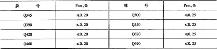9)热机械轧制(TMCP)或热机械轧制加回火状态交货钢材的碳含量不大于0.12%时,可采用焊接裂纹敏感性指数(Pcm)代替碳当量评估钢材的可焊性。Pcm应由熔炼分析成分并采用公式(5-2)计算,其值应符合表5-18的规定。 Pcm=C+Si/30+Mn/20+Cu/20+Ni/60+Cr/20+Mo/15+V/10+5B (5-2) 经供需双方协商,可指定采用碳当量或焊接裂纹敏感性指数作为衡量可焊性的指标,当未指定时,供方可任选其一。 表5-18 热机械轧制(TMCP)或热机械轧制加回火状态交货钢材Pcm值