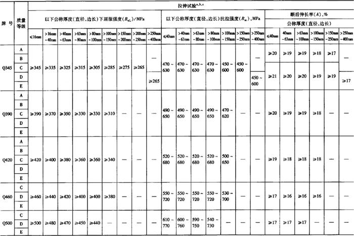 10)钢材、钢坯的化学成分允许偏差应符合GB/T222的规定。 11)当需方要求保证厚度方向性能钢材时,其化学成分应符合GB/T 5313的规定。 2.冶炼方法 钢由转炉或电炉冶炼,必要时加炉外精炼。 3.交货状态 钢材以热轧、控轧、正火、正火轧制或正火加回火、热机械轧制(TMCP)或热机械轧制加回火状态交货。 4.力学性能及工艺性能 (1)拉伸试验 钢材拉伸试验的性能应符合表5-19的规定。 (2)夏比(V型)冲击试验 1)钢材的夏比(V型)冲击试验的试验温度和冲击吸收能量应符合表5-20的规定。 2)厚度不小于6mm或直径不小于12mm的钢材应做冲击试验,冲击试样尺寸取10mm×10mm×55mm的标准试样;当钢材不足以制取标准试样时,应采用10mm×7.5mm×55mm或10mm×5mm×55mm小尺寸试样,冲击吸收能量应分别不小于表5-20规定值的75%或50%,优先采用较大尺寸试样。 3)钢材的冲击试验结果按一组3个试样的算术平均值进行计算,允许其中有1个试验值低于规定值,但不应低于规定值的70%,否则,应从同一抽样产品上再取3个试样进行试验,先后6个试样试验结果的算术平均值不得低于规定值,允许有2个试样的试验结果低于规定值,但其中低于规定值70%的试样只允许有一个。 (3)Z向钢厚度方向断面收缩率应符合GB/T 5313的规定。 (4)当需方要求做弯曲试验时,弯曲试验应符合表5-21的规定。当供方保证弯曲合格时,可不做弯曲试验。 表5-19 钢材的拉伸性能