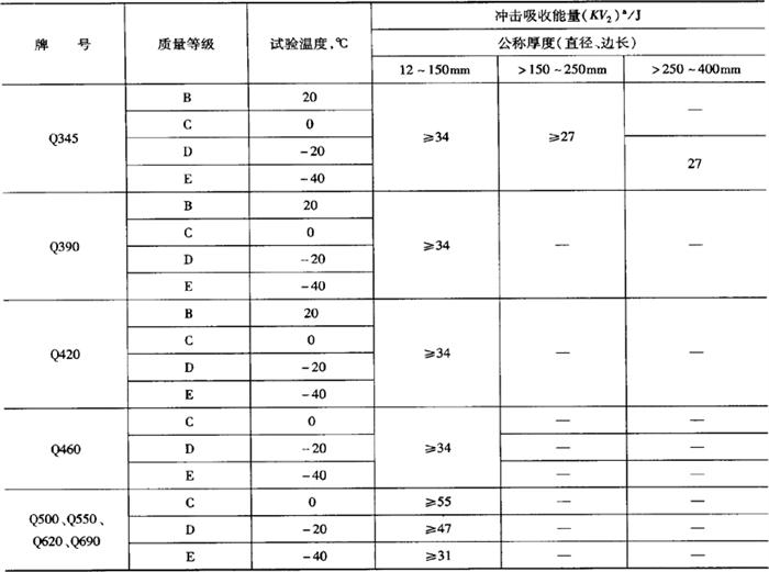 a.当屈服不明显时,可测量RP0.2代替下屈服强度。 b.宽度不小于600mm扁平材,拉伸试验取横向试样,宽度小于600mm的扁平材、型材及棒材取纵向试样,断后伸长率最小值相应提高1%(绝对值)。 c.厚度>250mm~400mm的数值适用于扁平材。 表5-20 夏比(V型)冲击试验的试验温度和冲击吸收能量