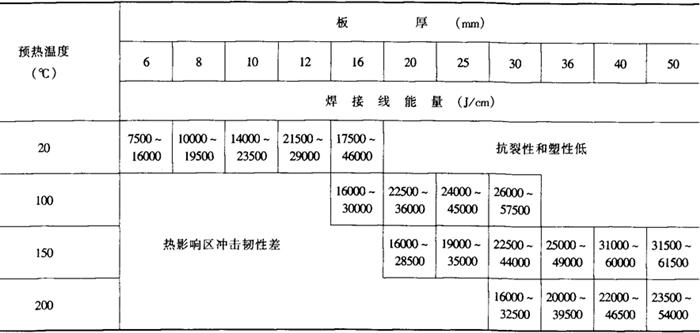 4)装配:装配间隙不能过大,要尽量避免强力装配,定位焊缝要有足够的厚度和长度(不小于50mm,对较薄的板不小于4倍板厚),必须采用与正式焊缝同一类型的焊条(强度等级可稍低),定位焊时预热与否同正式焊缝。在装配或焊接时,对高强度钢,特别是调质钢,严禁在非焊接处随意打弧。 (2)线能量的选择:对CE<0.4%的普通低合金钢,焊接线能量一般不限制。 对CE=0.4%~0.6%的低淬硬倾向钢,线能量下限按热影响区最高硬度不超过临界值的条件确定,上限由满足热影响区韧性的条件确定。 对CE>0.6%的低碳调质钢,应与其他参数(如钢材厚度、预热和层温)相关联地确定一个可用的线能量范围:上限从保证热影响区能得到低碳马氏体或贝氏体组织的条件确定,下限由热影响区塑性和抗裂性能确定。 总之,随着钢材CE值和强度级别的提高,钢材的热处理状态从热轧、正火到调质,适宜的焊接线能量值则随之降低,而可用的线能量范围也随之变窄。控制线能量是高强度钢焊接的一个重要原则。线能量对于焊缝金属的抗冷裂性和机械性能有着明显影响。随焊缝金属的强度级别及CE的提高,这一影响显着增大。 (3)预热、层间保温及后热:预热有防止冷裂纹,降低冷却速度,减小焊接应力作用,与适当的焊接线能量配合还可控制接头的组织和性能。不同强度等级钢的预热温度见表10-13和表10-14。为保持预热的作用并促进焊缝和热影响区的氢扩散逸出,层间温度通常应等于或略高于预热温度。预热与层间温度过高,均可能引起某些钢种的焊接接头组织与性能的恶化。 表10-13 几种热轧及正火钢的预热和焊后热处理工艺参数
