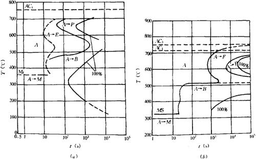 焊接低碳调质钢时,尽管热影响区的最高硬度不太高并有高的韧性,但氢仍是促成冷裂纹的重要因素。在整个工艺过程中要严格保持低氢条件。焊接材料中的氢和水分,坡口表面的潮湿、油迹等都严重影响焊接质量。此外,焊接工艺及参数的选择,都应力求有利于使焊缝金属中的扩散氢含量最低。如在保持冷却速度不低于临界值的条件下,除适当地选用预热温度和焊接线能量外,还需适当选择层间温度。必要时采用后热(等于或高于层温的温度下使焊缝继续保温一段时间)以加速氢的扩散逸出。 在用手弧焊或埋弧焊焊接18MnMoNb、14MnMoVB、14MnMoNbB和12Ni3CrMoV等钢的产品时,焊缝金属易产生横向裂纹,位于焊缝深处或扩展到了焊缝表面,大都垂直于焊缝中心线,彼此呈平行分布,有的延伸到热影响区。产生这类裂纹的主要因素是氢,同时,冷却速度也是不可忽视的因素。 某些类型的低合金高强度钢,还具有热裂纹倾向,热影响区微裂纹倾向,再热裂纹倾向和层状撕裂倾向。 4.中碳调质高强度钢的焊接特点 当要求σ,高达880~1176N/mm2以上时,必须提高含碳量,因为调质钢中合金元素的加入主要起保证淬透性和提高回火性的作用,而强度主要还是取决于含碳量。这类钢的含C量通常为0.25%~0.45%。这类钢的淬透性很大,因此焊接性较差,焊接工艺非常复杂,焊后必须通过调质处理才能保证接头的性能。这类钢的纯度对焊接性的影响特别重要。-般钢中S、P不大于0.04%即可,但在这些钢中甚至降到0.02%时还会有裂纹敏感性。S增加热裂敏感性,P降低塑性和韧性,提高冷裂敏感性。 (1)焊缝中的热裂纹:中碳调质钢含碳量及合金元素含量都较高,因此,液-固相区间较大,偏析也更严重,这就促使有较大的热裂纹倾向。例如30CrMnSiA钢,由于含碳、硅量都较高,因此热裂纹倾向较大。为了提高焊缝金属的抗热裂纹能力,不得不采用低碳低硅焊丝H18CrMoA。焊接中碳调质钢时,应该考虑可能出现热裂纹问题。所以在选择焊接材料时,应尽量选用含碳量低的,含S、P杂质少的填充材料。在焊接工艺上应注意保证填满弧坑和良好的焊接成形。因为热裂纹容易出现在未填满的弧坑处,特别是在多层焊时第一层的弧坑中以及焊缝中的凹陷部位。 (2)冷裂纹:中碳调质钢的淬硬倾向十分明显,冷裂倾向较为严重,这是由于中碳调质钢的含碳量较高,加入的合金元素也较多,在500℃以下的温度区间过冷奥氏体具有更大的稳定性所致(图10-25a、b)。而且含碳量越高,淬硬倾向也越大。中碳调质钢对冷裂纹的敏感性之所以比低碳调质钢大,不仅在于淬火倾向大,而且由于Ms点较低,在低温下形成马氏体,一般难以产生“自回火”效应,并且由于马氏体中的含碳量较高,有很大的过饱和度,点阵的畸变就更严重,因而硬度和脆性就更大,对冷裂纹的敏感性也就更大。马氏体的硬脆程度随含碳量的提高而增加,因此钢的冷裂敏感性也随着含碳量的提高而增加。所以在分析各种钢的冷裂敏感性时,不仅要看它马氏体形成的倾向,而且还必须考虑到马氏体的类型和性能。焊接这类钢时,为了防止冷裂纹,除采取预热措施外,焊后必须进行及时的回火处理。