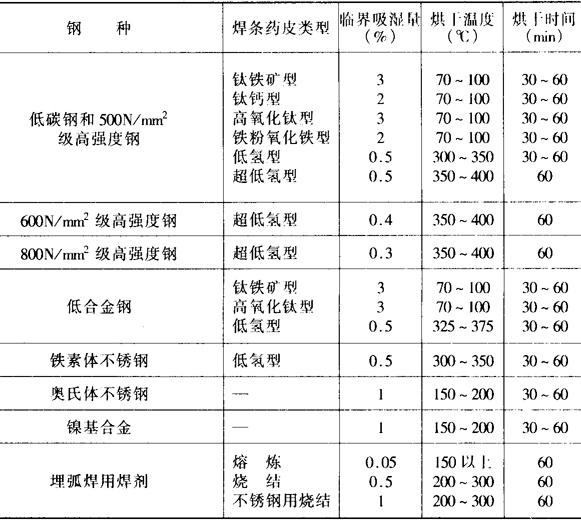 焊条、焊剂使用前必须严格烘干,以减少氢的来源,防止冷裂纹。烘干后的焊条、焊剂,应采取措施防止使用前吸潮,如在100~150℃的干燥箱中保存,随用随取。 6.低合金高强度钢的焊接工艺 (1)焊前准备: 1)坡口加工:一般可用火焰切割或碳弧气刨,要求精度高时,可采用机械加工。火焰切割时须注意母材的过热软化(对调质钢)和淬硬脆化(对淬硬倾向高的钢);坡口边用冷剪切时,应注意加工硬化。 2)坡口清理:坡口两侧500mm范围内应去除水、油、锈及脏物等。 3)焊接材料准备:焊条、焊剂应参照表10-12烘干,焊丝应严格除油;有的保护气体需脱水处理。 表10-12 焊接材料的吸湿临界值和标准烘干规范
