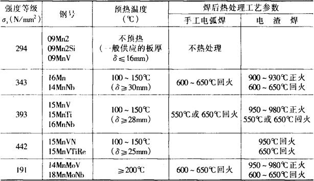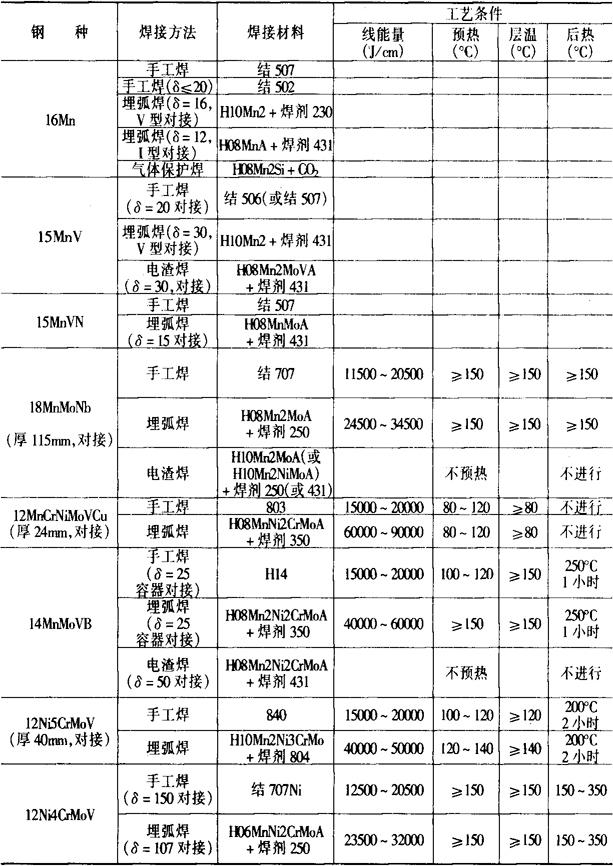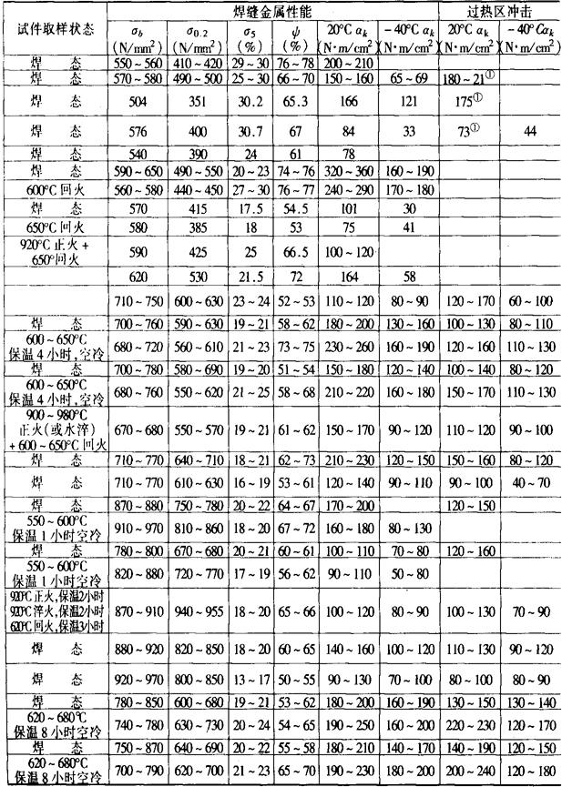 注:①HY-130的最高预热温度建议:板厚16mm——65℃,16~22mm——93℃,22~35mm——135℃,>35mm——149℃。 强度级别较高的低合金钢和大厚度的焊接结构,后热温度一般在200~350℃范围内,保温时间与焊件厚度有关,一般为2~6h。后热也称“消氢处理”。如工艺中已确定要焊后热处理,且做到焊后立即热处理,则后热可省略。 预热、层间温度及后热的加热,应在坡口两侧75~100mm范围内保持一个均热带。测温点在距坡口75~100mm处。加热最好在焊缝的背面进行。对调质钢要防止局部超过回火温度。 (4)奥氏体焊条的使用:在某些情况下,例如大刚性结构,铸、锻件接管的焊接,缺陷修复,焊接不允许进行预热的部位,焊后又无法进行热处理时,在不要求焊缝与母材等强度的条件下,通常采用奥407和奥507焊条。焊接时要使母材的熔合比尽量小。 (5)缺陷返修:缺陷要彻底除净,可用机械加工或碳弧气刨,坡口要合适。用碳弧气刨要防夹碳。气刨预热温度与同牌号钢焊接同。补焊时预热、层温及后热的加热范围要适当加宽,温度与焊接同或稍提高。 7.低合金高强度钢的焊后热处理 (1)焊后热处理的种类:低合金高强度钢,特别是强度等级较低的,多数情况下焊后不热处理。 低合金高强度钢焊后热处理有三类: 1)消除应力退火:用于板厚较大,焊接残余应力较大的结构,低温下工作的结构,承受动载荷的结构,有应力腐蚀性能要求或尺寸稳定性要求的结构。 2)正火+回火(或正火):用于电渣焊结构,改善接头组织及性能。 3)淬火+回火(调质处理):用于调质钢或其他要求焊后进行调质处理的结构。 (2)焊后热处理应注意的问题: 1)对于含有一定数量的V、Ti或Nb的低合金钢,在600℃左右保温,易造成韧性明显下降,同时强度升高,塑性降低,此类钢应尽量避免在此温度下保温。 2)焊后消除应力退火,一般应比母材的回火温度低30~60℃。 3)对于含有一定数量的Cr、Mo、V、Ti、Nb等元素的一些低合金钢焊接结构,消除应力退火时应防止再热裂纹。 4)热处理过程中要注意防止结构产生变形。 8.低合金高强度钢焊接接头的机械性能见表10-15。 表10-15 低合金高强度 钢焊接接头机械性能举例