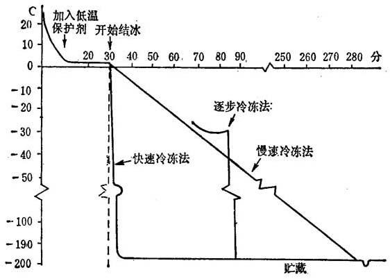 | 释义 | 低温保存法 (一)冷冻方法 对组织生活力来说,贮藏细胞内的水晶类型是很重要的。由此提出了三种不同类型的冷冻过程:(1)慢速冷冻法:温度下降速度为0.1-10℃/min。(2)快速冷冻法:温度下降速度为50-1200℃/min。(3)逐步冷冻法:先用慢速冷冻法使温度降至-20——40℃,然后放置一段时间,再用快速冷冻法降至-196℃(液氮中)。每种方法所用的温度概括于图13-1,这些方法的贮藏温度均在-70——196℃间,温度改变会导致水晶体积增大。