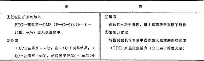 稀释的低温防护剂溶液(如5-10%DMSO)必须逐步加入,两次间隔时间至少5min,以防发生质壁分离,这一步骤必须在冰浴中进行,因为室温下将影响细胞和组织的生活力。在最后一滴防护剂加入后至冷冻前,应有20-30min的间隔期。 也可使用几种低温防护剂的混合液。Ulrich等(1979)和Finkle等(1980)将棕榈的胚性愈伤组织块放入含10%聚乙二醇,0.44M葡萄糖和10%DMSO的混合液中,冷冻后愈伤组织仍能长出植株。 2.慢速冷冻法 这是最常用的一种方法,活细胞以-0.1-10℃/min的速度缓慢冷冻,这对脱水有益,能使细胞间冻结的水分减至最少。 已有许多温度控制仪包括有计算机编译系统的冷冻机。这些仪器很贵,但确使许多物种保存获得成功。Oryza Sala等(1979)在进行慢速冷冻时使用了较便宜的杜氏(Dewar)瓶。 3.快速冷冻法 冷冻得越快,细胞间的冰晶就越小。将植物材料放入小瓶中直接投入液氮,温度下降速度可达-3000——1000℃/min,甚至更快。这种方法简易,当装有植物材料的小瓶放在液氮上的空气环境中时,温度下降速度有所减慢(-10——70℃/min)。也可用干冰(CO2)代替液氮。 用于快速冷冻的低温防护剂的使用方法与慢速冷冻法相同。使用何种冷冻法决定于样本中水分含量,一般含水量低的小样本似乎用快速冷冻法适宜。在所有快速冷冻保藏报告中,都没有认为其解冻后的质壁分离的复原差于慢速冷冻法。 4.逐步冷冻法 这种方法集上述两种方法之长。用慢速冷冻使温度降至-20——40℃,使细胞保护性失水,然后在液氮中快速冷冻,以防在重要的生化结构间形成大冰晶。此法也需要低温防护剂,用法与前述相同。 逐步冷冻法对悬浮培养体很为理想,但对有结构的组织并不适宜。 (二)植物材料和设备 1.植物材料 对每个物种来说,许多类型的组织均能用于冷冻。经常采用愈伤组织,尤其是热带植物的愈伤组织。愈伤组织在继代一段时间后(一个或一个多星期,取决于生长率),处于健壮的,快速生长时期,这时对冷冻危害抗性最强。在取材时,要避免取那些愈伤组织顶部的老化变黑的细胞。愈伤组织培养物会显出不同的生长习性,因此在实验操作时,要用不同的继代技术。愈伤组织长成大而易碎的团块,则应切成小块,否则它们可能增殖成松散的结合块,或者在琼脂上长成纸状薄层或粘稠状团块。对高度含水的品系(如许多禾谷类)可用刮勺,将愈伤组织刮在一起,然后继代。另外,对某些培养物或某些情况下用瓶中或试管里悬浮培养的植物材料,则用大头吸移管转接的效果较好。 2.培养基和清洗液 Murashige和Skoog(MS)培养基或者对所取组织适合培养的培养基,均可使用。禾谷类培养常用MS基本培养基,另加生长素2,4-D(4.5μM)和IAA(5.7μM),以及细胞分裂素KIN(4.6μM)、L-谷氨酰胺(1mM)和蔗糖(0.037M)。制成固体培养基,可在消毒前加1%琼脂。 解冻后用来清洗样本中的低温防护剂的简单无菌清洗液,它只包含MS大量元素和0.87M蔗糖。 3.低温保护剂溶液 许多单一的化学物质或它们的混合物均被用过,其中最有效的是PGD溶液。该溶液包含有聚乙二醇(PEG6000,10%w/v)、葡萄糖(0.44M)和二甲亚砜(DMSO,10%)。 4.仪器 无菌转接需要用一个灭菌的或有气流装置的通风柜(超净台)。 (1)培养室中温度控制 对于悬浮培养体还需要有摇床,以利通气和瓶中溶液的搅拌。 (2)用于组织冷冻的试管 需用厚壁的,用硼酸玻璃(派热克斯玻璃)制成的12ml的锥形离心管,其上要有刻度,瓶有螺旋帽或者用重铝箔(100μm厚)盖住。也可用几种型号的带有塑料螺帽的冷冻小瓶。玻璃试管上的刻度有利于在实验中做到基本定量或者可以估计出所装细胞溶液的体积,而塑料小瓶具有占用贮藏面积较小的特点。 (3)吸移管 灭菌的长头吸移管,长约20cm,顶上装有橡皮球,在进行愈伤组织样本处理时,可用它来滴加或移去溶液。 (4)试剂瓶 应能高压消毒,用于装有少量的无菌液(如加入到样本中的清洗液)。 (5)冷冻设备 冷冻既可以在不同温度(-10,-15,-23,-30℃)的冰浴中逐步进行,每种温度处理4 min;也可以在连续变化的冷冻浴中进行。这种冷冻浴浸渍于冷却器内,其内装有广泛使用的简单化合物所组成,或者就是一种较为复杂的调控仪。温度下降速度为1-3℃/min以及在-4——10℃温度下逐步形成冰块,这种处理,组织复活率较高。 液氮瓶、附属小的液氮盛器(双层壁的Dewar杯或瓶)以及液氮样本贮存器是必需的,以便于在-196℃下进行组织处理和贮藏。 (三)冷冻贮藏程序(表13-3) 表13-3 冷冻、解冻及植物细胞鉴定步骤概要