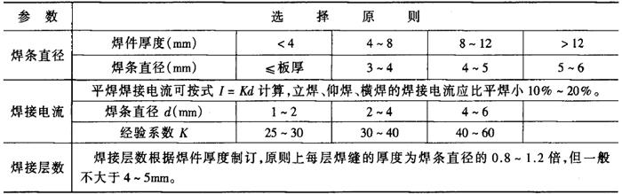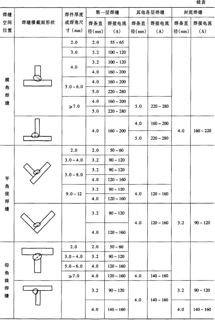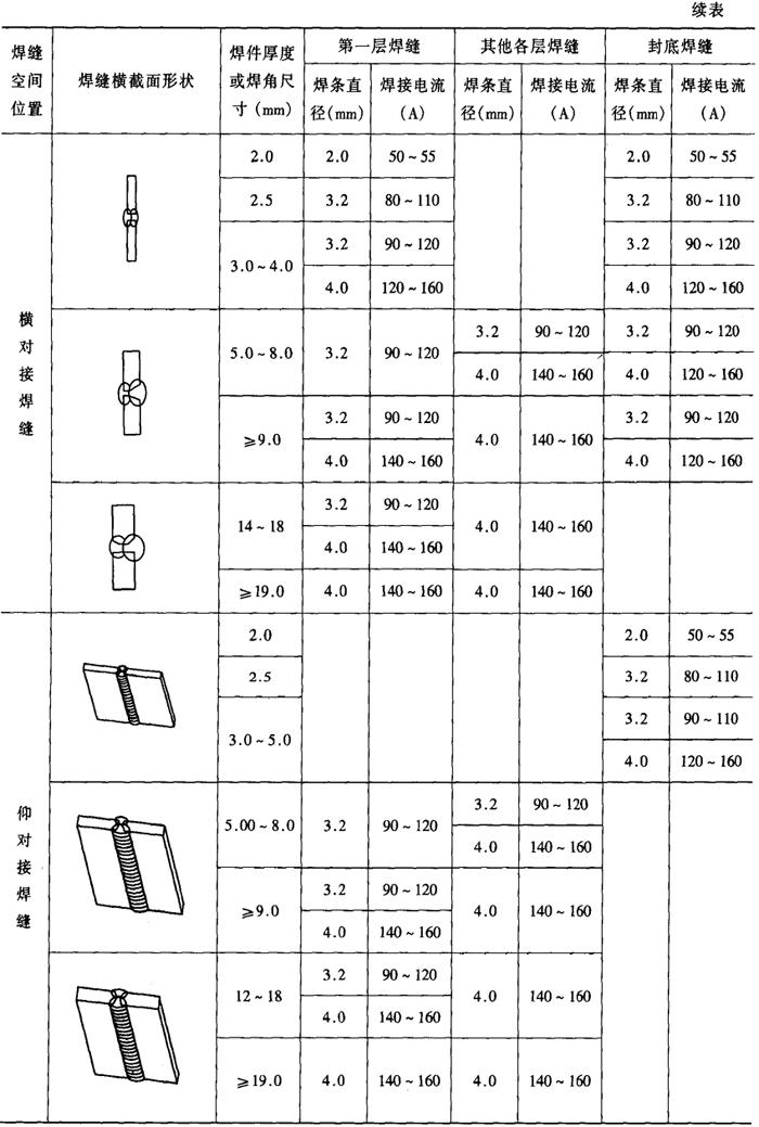 (3)焊接工艺参数 手工电弧焊主要的焊接工艺参数是焊接电流,应在保证焊接质量的基础上,尽量采用大电流。一般情况下可根据板厚,选用合适直径的焊条和层数,然后根据焊条直径选择焊接电流,焊条直径与焊接电流的关系见表2-2-22。表2-2-23为不同空间位置采用的典型坡口形式及其焊接工艺参数。 表2-2-22 焊条直径与焊接电流的关系[4]