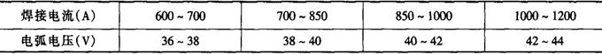 (3)焊接工艺参数 埋弧焊焊接工艺参数主要包括焊接电流、电弧电压、焊接速度,焊丝直径、焊丝干伸长、装配间隙等。埋弧焊时,电弧电压是根据焊接电流确定的,即一定的焊接电流时要保持一定范围的弧长,以保证电弧的稳定燃烧。表2-2-28给出了焊接电流及相应的电弧电压。表2-2-29则给出了不同直径的焊丝所应采用的焊接电流。 表2-2-28 焊接电流和相应的电弧电压[4]