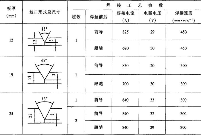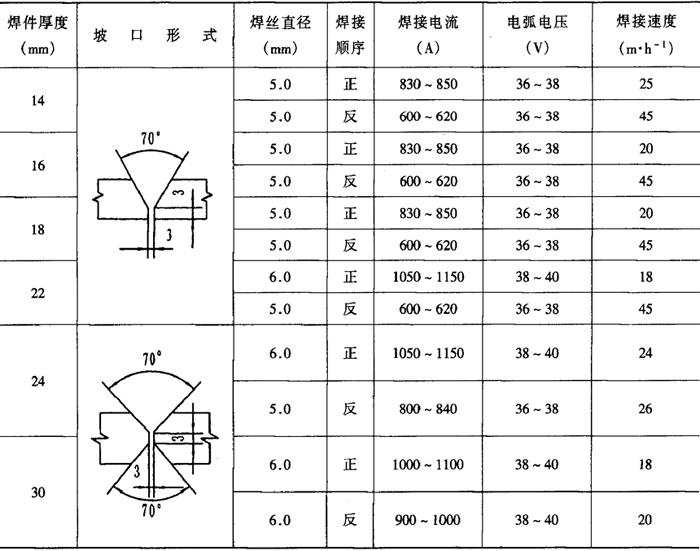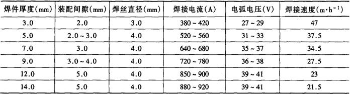 注:HJ431、焊丝直径5mm。 表2-2-32 低碳钢开坡口双面埋弧焊焊接工艺参数[3,4]