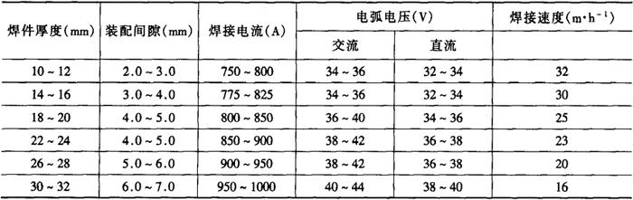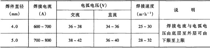 注:正面焊缝在焊剂垫上焊接。 表2-2-33 低碳钢厚板深坡口埋弧焊焊接工艺参数[4]