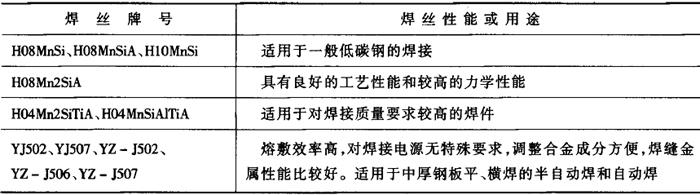(4)焊接工艺要点: ①第一层焊缝可采用手工电弧焊或钨极氩弧焊焊接。 ②当工件较厚或刚性较大时,重要焊件焊后需进行600~650℃的回火处理,保温时间根据板厚确定,一般每毫米板厚保温1~2分钟,最短不少于30分钟,最长不超过3小时。 ③埋弧焊焊接线能量较大,会使焊接热影响区晶粒过于粗大,从而降低这一区域的冲击韧性,可根据具体情况进行焊后正火或退火(加热到920~940℃,在空气或炉中冷却)处理,以提高焊缝的塑性和冲击韧性。 3.气体保护焊 焊接碳钢最常用的气体保护焊方法是二氧化碳气体保护焊和混合气体保护焊。二氧化碳气体保护焊生产效率高,焊接变形小,对油、锈不太敏感,操作简单,成本低,在工矿企业中应用广泛,比较适合于薄板的焊接。混合气体保护焊是在氩气中加入一定的二氧化碳和氧气,以改善纯氩时的电弧特性,飞溅小,焊缝成形好,可用于平焊、立焊、横焊和仰焊以及全位置焊接,该方法也适合于薄板的焊接。 (1)焊接材料选择 气体保护焊的焊接材料主要是保护气和焊丝。对于二氧化碳气体保护焊,其保护气是二氧化碳,焊接材料的选择主要指焊丝的选择。焊丝可分为实芯焊丝和药芯焊丝。表2-2-38给出了适合于二氧化碳气体保护焊的实芯和药芯焊丝的性能及用途。 表2-2-38 二氧化碳气体保护焊焊接材料选择[5]
