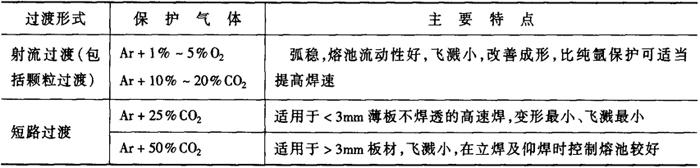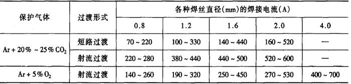 采用混合气体保护时,混合气体中所加的氧气和二氧化碳的比例不同,气体的氧化性也不同。从焊缝的强度考虑,焊丝成分应该与基本金属相适应。由于气体的氧化性不同,焊接过程中对合金的烧损也不同,选择焊丝成分时应考虑气体成分。焊丝中可以适当提高硅、锰等脱氧元素的含量,其他成分可以与母材相一致,也可以有若干差别。部分二氧化碳焊丝可以用于混合气体保护焊。表2-2-39是可以选用的混合气体及其主要特点。表2-2-40是混合气体保护焊焊接钢时的典型焊丝成分。 表2-2-39 碳钢焊接的混合气体选择[7]