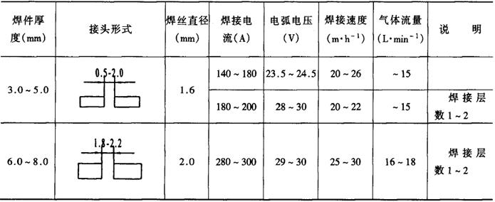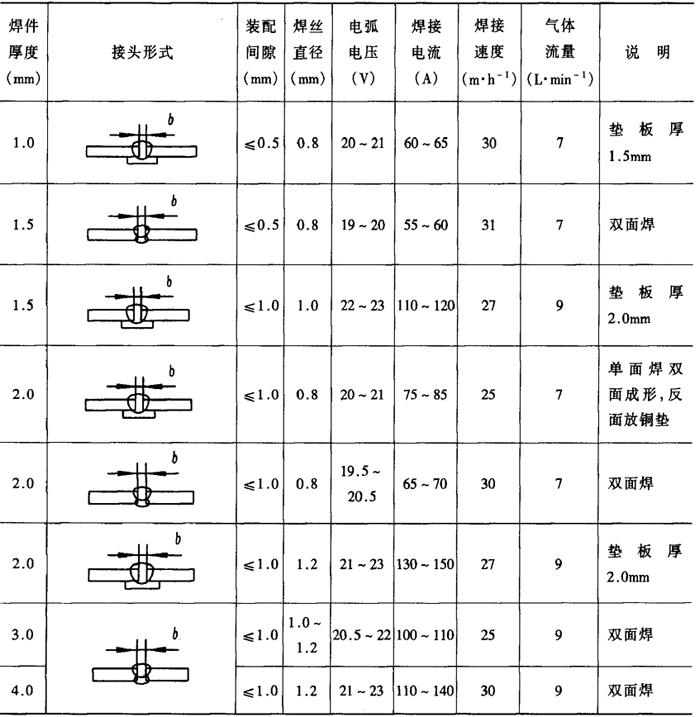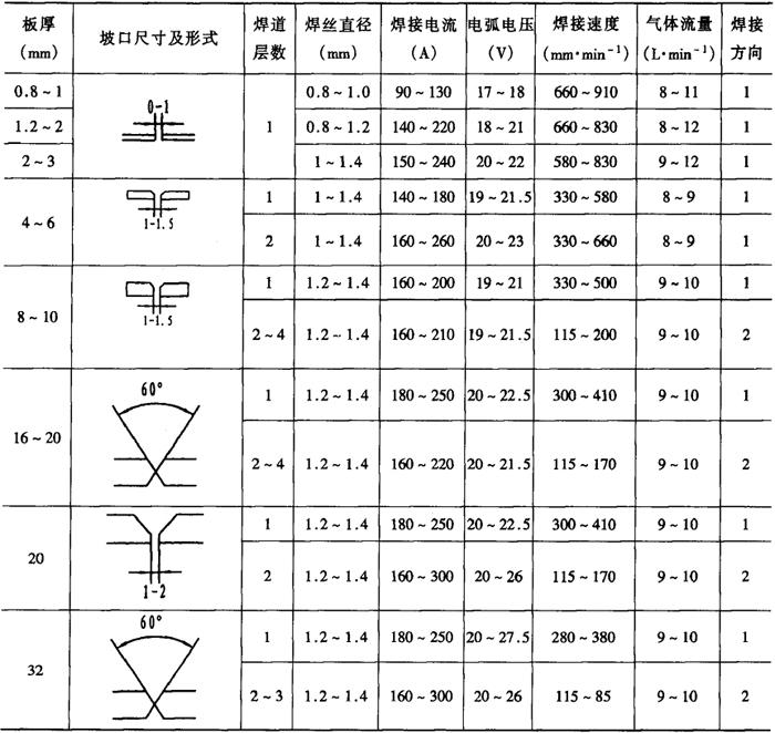 注:横焊、立焊、仰焊的电弧电压取表中下限值。 表2-2-42 细丝二氧化碳气体保护焊焊接工艺参数[4]
